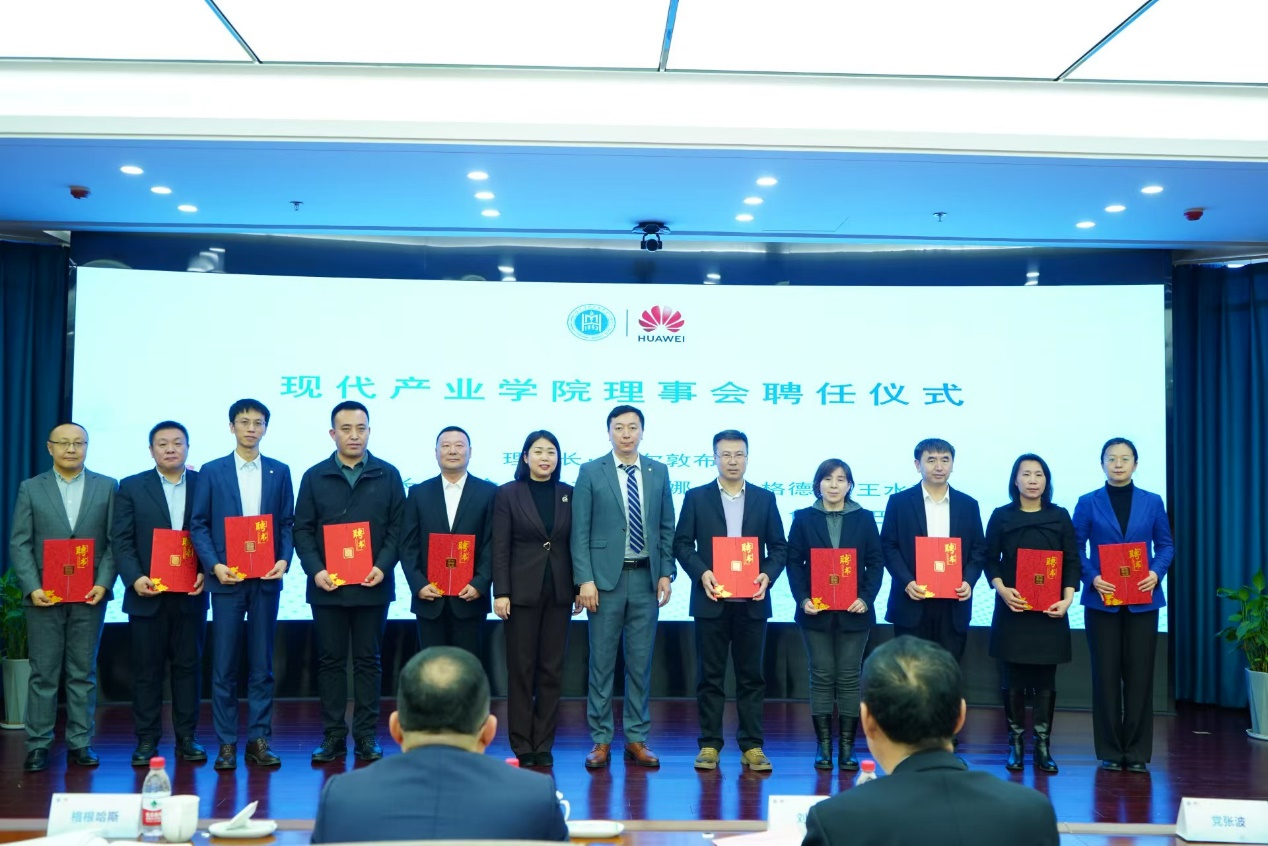 期間,進行華為現代產業學院理事會聘任儀式,由格根哈斯、黨張波為理事會成員頒發聘書。額爾敦布和任理事長,包倉、王傳杰、肖查娜、包烏格德勒、王水英任副理事長,郝鑫宇、于海奇、齊瑞、杜鳳懿、色登丹巴任理事。