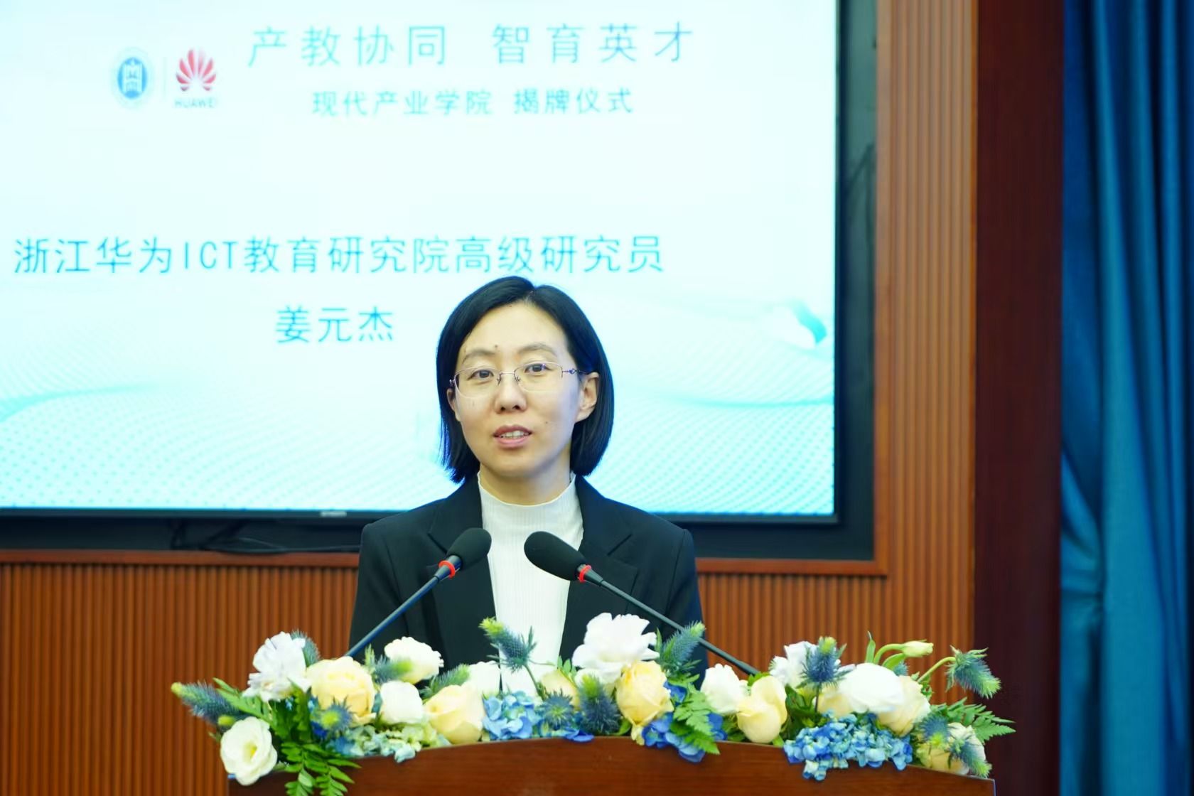 同期,進行了現代產業學院專家論壇,浙江華為 ICT 教育研究院高級研究員姜元杰以“華為數智人才培養實踐分享”為主題做了專題講座。